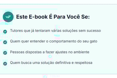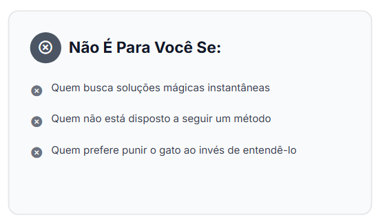 Entender a linguagem do seu gato, identificar os gatilhos de estresse e aplicar o Método Caixa Perfeita — um passo a passo validado por comportamento felino que resolve o problema pela raiz.